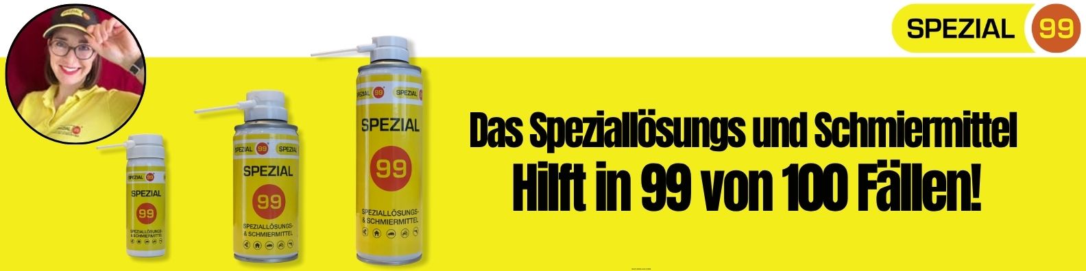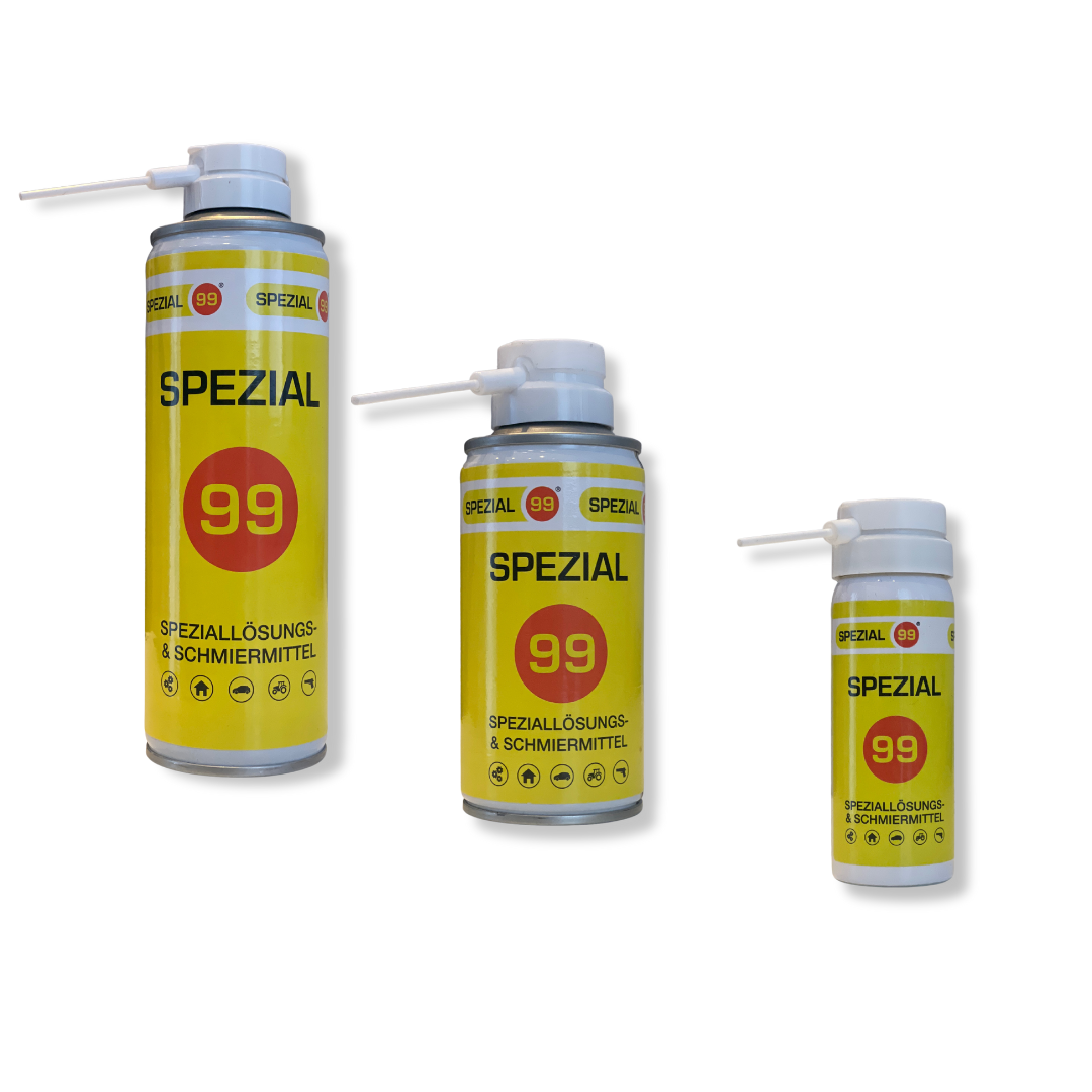 Spezial 99 ist ein Löse- und Schmieröl sowie Pflege- und Reinigungsmittel mit hervorragendem Kriechvermögen, wodurch es selbst in feinste Kapillarrisse eindringt und dabei Verschmutzungen, Oxide und Feuchtigkeit unterwandert.
